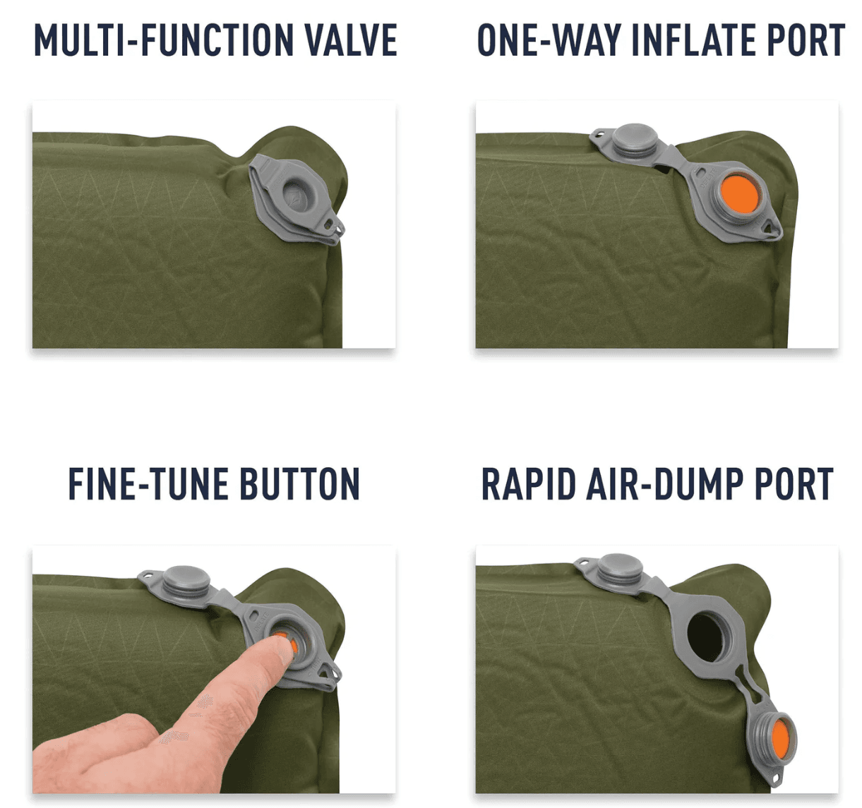 - Válvula multifuncional flip-over para ajuste fino da pressão do ar, inflação rápida e deflação fácil.