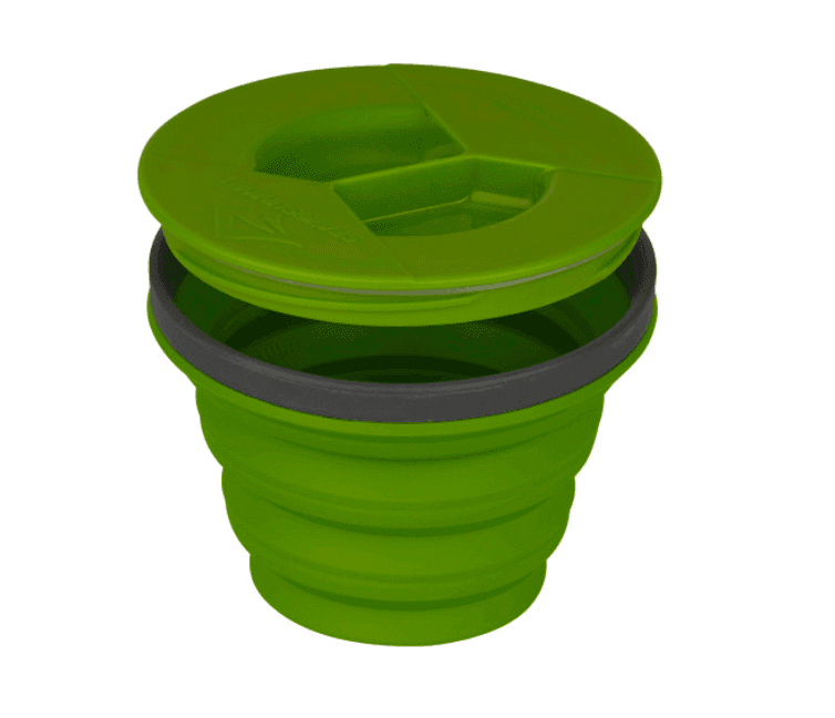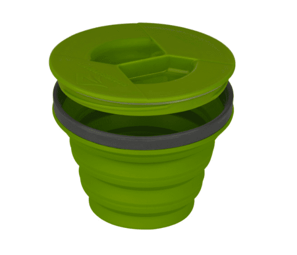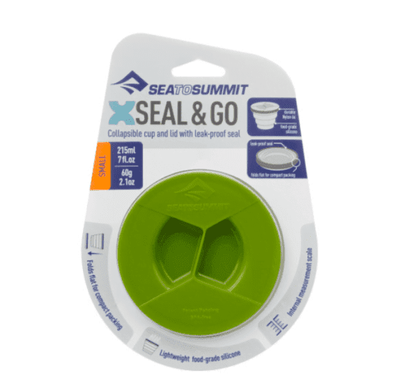 As tampas de rosca são simples e fáceis de manusear, impedindo derrames de líquidos. Quando não está em uso cada recipiente colapsa, permitindo ocupar muito pouco espaço na mochila. Este copo está disponível em quatro tamanhos diferentes.
