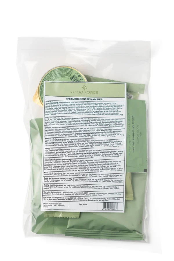 O Pack Massa à Bolonhesa é a refeição ideal para quem busca praticidade, energia e nutrição durante suas atividades ao ar livre. Além disso, ele é composto por uma combinação deliciosa de macarrão à bolonhesa, biscoitos salgados, carne de frango, amendoim com mel e sal, barra energética de amendoim, refresco de framboesa, chá preto, açúcar, sal e lenços humedecidos. Portanto, este pack oferece tudo o que você precisa para sustentar a energia e o corpo durante caminhadas, trilhas ou acampamentos.