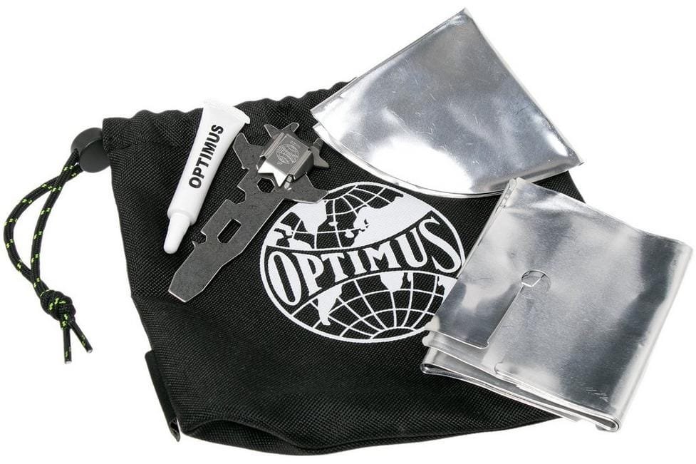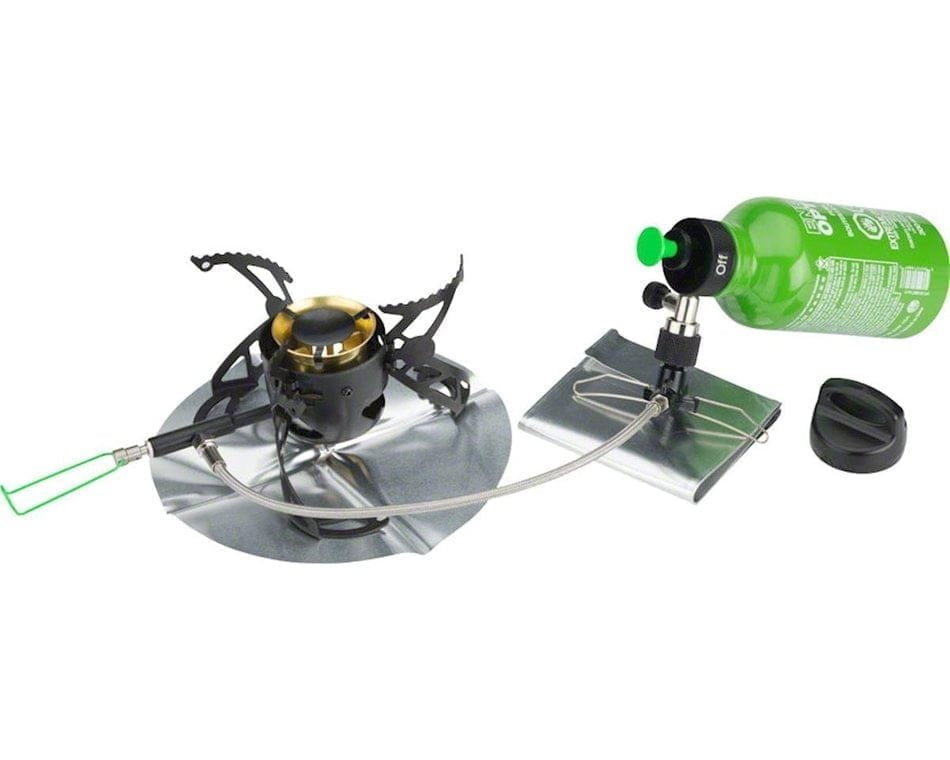 O Kit inclui: Fogão, bomba FLIPSTOP ™, Garrafa de combustível 0.4L, multi-ferramenta, pára-ventos, refletor de calor, saco de transporte, lubrificante, manual do utilizador
