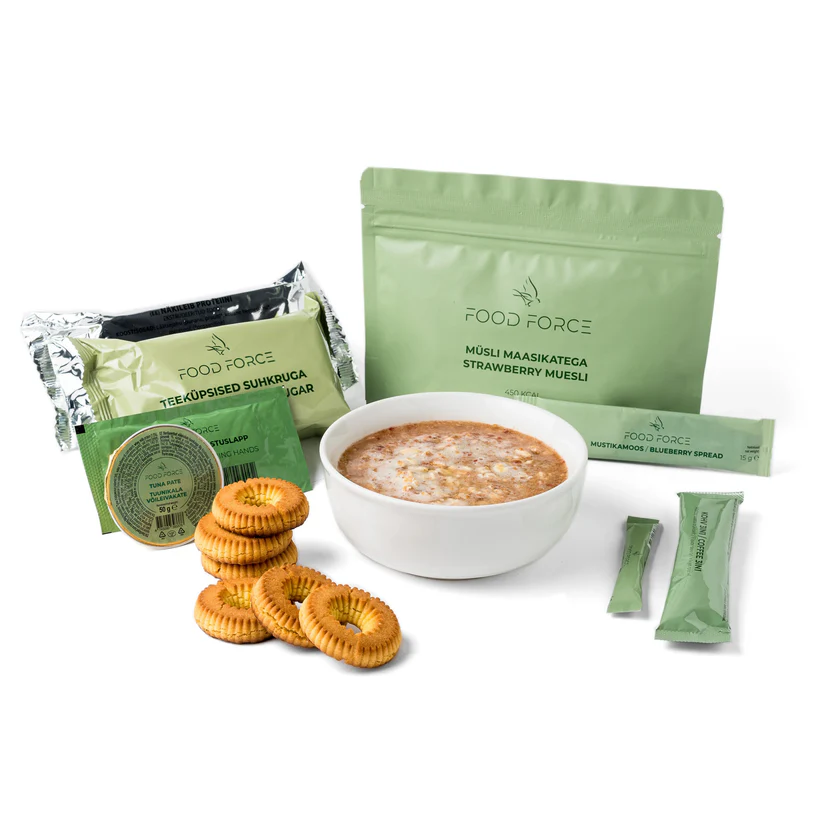 Esta ração contém vários componentes que proporcionam energia e sabor. Para começar, o muesli de frutas vermelhas (100g) é rico em fibras e antioxidantes, ajudando a prolongar a saciedade. Em seguida, o creme de mirtilo (20g) apresenta um sabor natural e propriedades antioxidantes. Além disso, os biscoitos de aveia com queijo (50g) são crocantes e nutritivos. De igual forma, o patê de fígado (100g) é uma fonte rica em proteínas e ferro, essenciais para a recuperação muscular. Para complementar, o chocolate amargo 60% (20g) fornece energia rápida e um sabor intenso. Adicionalmente, o café 3 em 1 (18g) mantém a energia mental e a concentração elevada. Para terminar, o açúcar (4g) oferece uma dose extra de energia rápida, enquanto o lenço humedecido (5g) é útil para manter a higiene após a refeição. Dessa forma, a ração apresenta uma combinação completa, saborosa e energética, perfeita para qualquer aventura.
