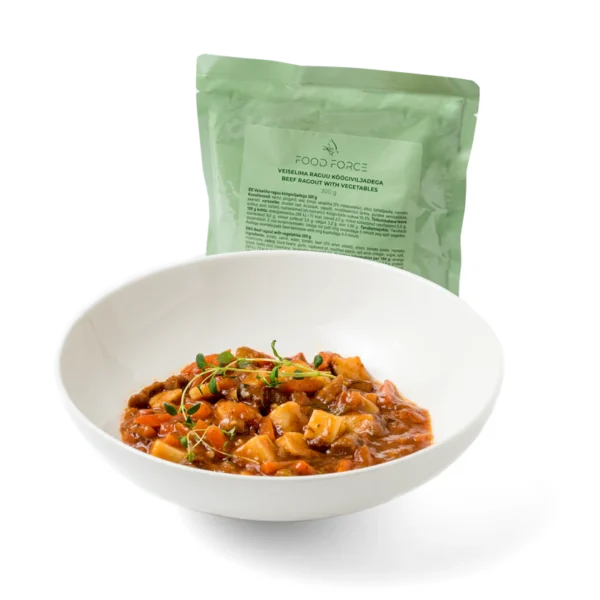 Ingredientes: Batata, cenoura, água, tomate, carne bovina (9% quando adicionado), cebola, extrato de tomate, cogumelos nameko, aipo, feijão preto, alho, óleo de colza, amido modificado, vinagre de vinho tinto, açúcar, sal, especiarias, alecrim, ervas. Conteúdo vegetal: 56,5%.