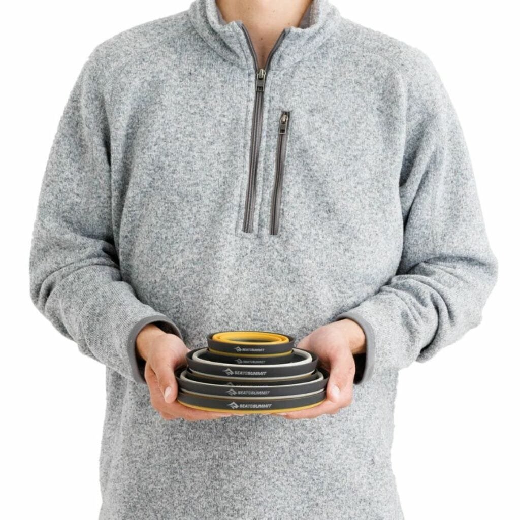 Cada peça do Set Frontier Sea to Summit utiliza nylon 66 reforçado com fibra de vidro e silicone de grau alimentício certificado pela UE. Estes materiais garantem, não só a segurança durante o uso, mas também uma resistência superior a condições adversas. Além disso, o design dobrável permite que os itens ocupem muito pouco espaço, facilitando assim o transporte durante as suas atividades.